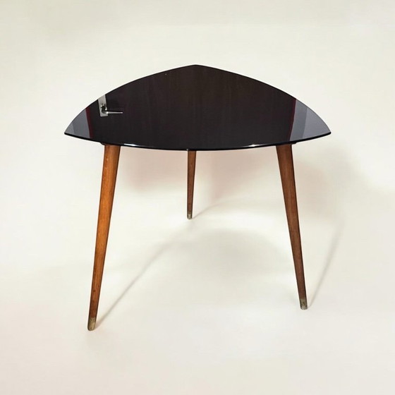 Voeg een vleugje retro charme toe aan je huis met deze stijlvolle niervormige tafel uit de jaren 1960. Het unieke driehoekige ontwerp maakt het een echte blikvanger en past perfect in elke vintage of Mid Century woonkamer. Het zwarte glazen blad zorgt voor een elegante look, hoewel het gebruikssporen vertoont: krassen en twee kleine chips op de onderrand geven de tafel zijn authentieke, charmante vintage charme. (Zie foto's).
