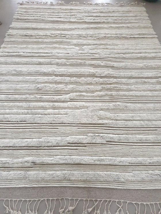 Ervaar de tijdloze elegantie van dit nieuw handgeknoopte tapijt, vervaardigd uit 100% natuurlijke Nieuw-Zeelandse wol. Dit meesterwerk combineert hoogpolige en laagpolige structuren, waardoor een dynamisch en toch subtiel patroon ontstaat dat elke ruimte verrijkt.