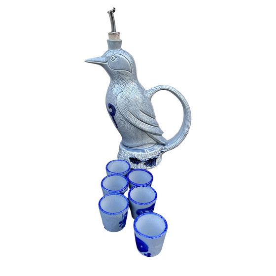 Steengoed servies voor koude dranken en likeuren in de mid-century moderne stijl, geproduceerd in Duitsland in de tweede helft van de 20e eeuw voor Staffel Steengoed. Een set voor 6 personen, inclusief een kan met een handvat in de vorm van een koffievogel en 6 glazen. Een servies met een interessante, unieke vorm, versierd met schilderingen met bloemmotieven in kobaltblauw. De set is in perfecte staat - het is een new-old stock item - nieuw, nooit gebruikt met de originele doos. item gesigneerd op de basis. Afmeting: hoogte 33 cm | diameter 12 cm | breedte 23 cm