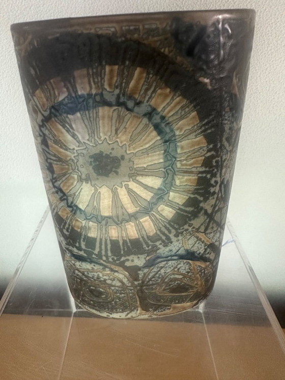 Deze prachtige vaas uit de Baca-serie van Nils Thorsson voor Royal Copenhagen is een prachtig voorbeeld van mid-century modern design. Dit stuk, gemaakt in de jaren 70, toont complexe patronen en een harmonieuze mix van aardse tinten, waardoor het een perfecte aanvulling is op elk verfijnd interieur.