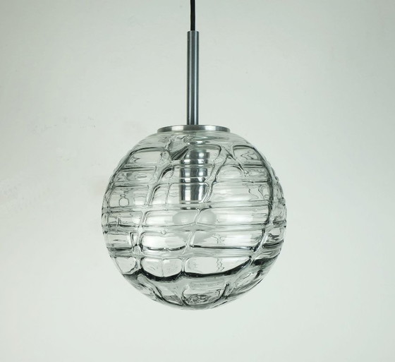 Een zeer mooie en elegante hanglamp uit 1960/70 van Doria-Leuchten, Duitsland. Helder glas en rookgrijs glas met een gestructureerd oppervlak. De houder is gemaakt van zilverkleurig metaal met een mat geborstelde afwerking, zwart elektrisch snoer, zwarte kap.