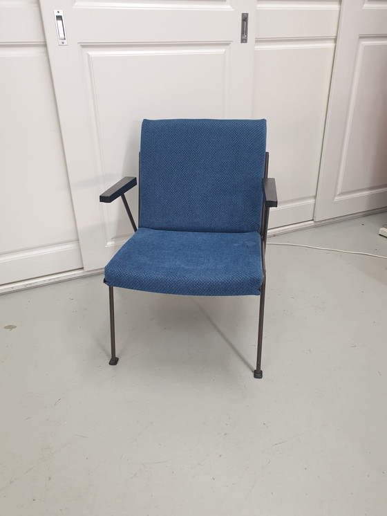 Mooie Oase fauteuil, ontworpen door Wim Rietveld en geproduceerd door Ahrend de Cirkel. Dit industriele ontwerp won de Signe d'Or-prijs voor meubeldesign op de Salon in 1959. Het frame van de fauteuil is in orginele staat. De bakelieten armleuningen missen minimale fragmenten (zie foto's). De stoel is voorzien van nieuw koudschuim en opnieuw gestoffeerd met een mooie diepblauwe meubelstof.