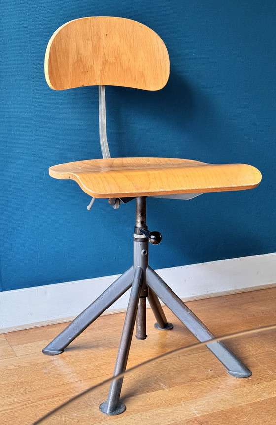 Vintage stoel uit de jaren 1950 geproduceerd door JASTOL, stalen meubelen, Wierden naar ontwerp van Odelberg & Olsen. In gebruikte maar zeer goede staat. - Draaibaar - In hoogte verstelbaar dmv de bakelieten trekknop - Metalen frame - Verstelbare rugleuning van gegoten aluminium - Zitting 40 x 40 cm rugleuning 34 x 18 cm