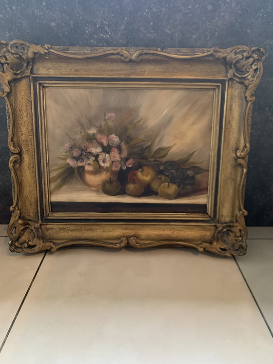 Laat u betoveren door de tijdloze elegantie van dit prachtige olieverfschilderij, een klassiek stilleven dat de delicate schoonheid van bloemen en fruit vastlegt. Het kunstwerk is vakkundig ingelijst in een sierlijke, goudkleurige houten lijst, wat de traditionele charme versterkt en het perfect maakt voor elk klassiek of traditioneel interieur. De zachte, ingetogen kleuren en de verfijnde penseelstreken nodigen u uit om de subtiele schoonheid en het vakmanschap van dit stuk te waarderen.