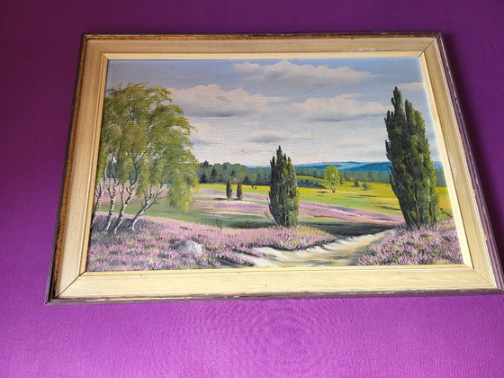 Olieverfschilderij van een heidelandschap uit de jaren 1930/1940.