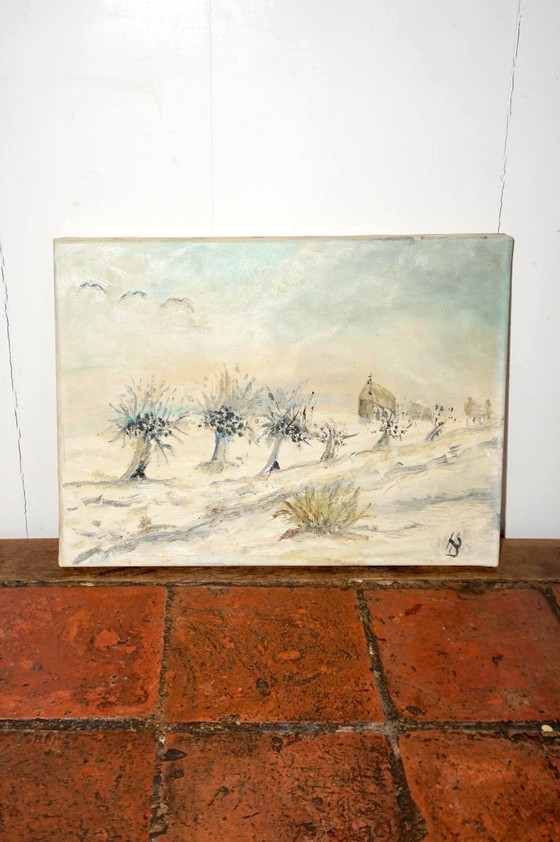 Tags: winterlandschap, olieverfschilderij, gesigneerd kunstwerk, besneeuwd landschap, vintage schilderij, landelijke kunst, Europees landschap, origineel kunstwerk, schilderij met textuur, rustieke wanddecoratie, boerderijkunst, gedempte tinten