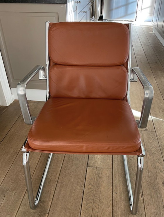De stoel is een cantilever-model (met sledevoet) geïnspireerd op Bauhaus-design, vergelijkbaar met de S34 of MG5 modellen. Hij heeft een elegante en minimalistische structuur van gepolijst, verchroomd buisvormig staal dat de basis, rugleuning en armleuningen vormt. De gestoffeerde zit- en rugkussens zijn bekleed met cognac- of lichtbruin leer (of kunstleer).