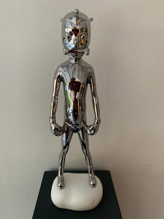 Dit stainless steel beeld met marmeren sokkel is van de Chinese kunstenaar Zhang Yong. Het stelt een onverschrokken nar voor. Een beeld dat hij ook in een 2,5 meter grote uitvoering heeft gemaakt en nu in eigendom is van een privé museum. Het beeld heeft editie nummer 4/8 en wordt met certificaat geleverd. Is het enige exemplaar in Europa! Hoogte ca 42 cm.