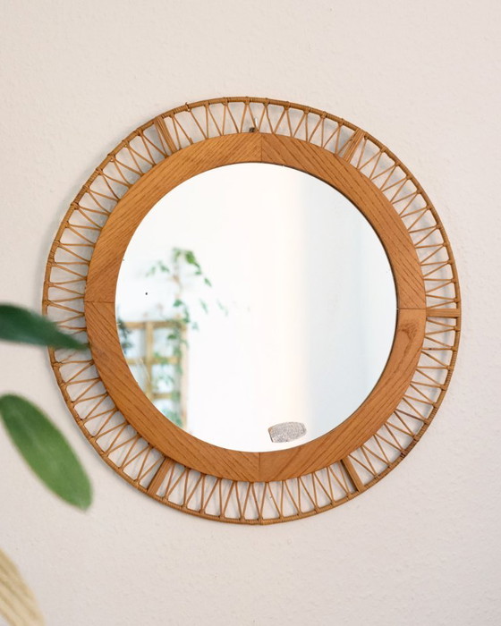 Een ronde, Oost-Duitse (DDR) wandspiegel uit de jaren 60-70 met een prachtig houten frame en fijn rotan vlechtwerk – een authentiek vintage stuk met een vleugje boho charme. De combinatie van natuurlijke materialen en strakke lijnen zorgt voor een tijdloze look en past perfect in interieurs in mid-century, Scandinavische of relaxte boho stijl. Een bijzonder charmant detail is de originele sticker op het glas, die de "gegarandeerde verzilvering" aangeeft – een mooi detail met een verhaal.