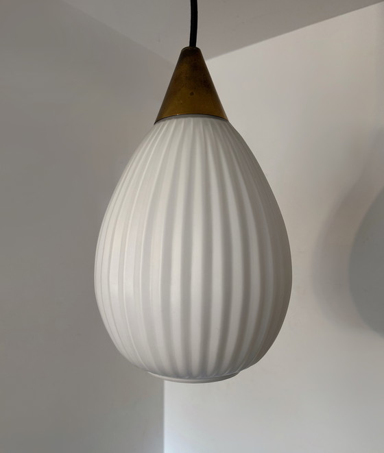 Prachtige Scandinavische kroonluchter in druppelvorm uit de jaren 60 van Louis Kalf in mat wit gestreepte opaline en vergulde metalen kegels; zeer goede staat (oxidatie op het metaal en lichte slijtage aan de rand bij de fitting: zie foto's) voor grote schroeflamp.
