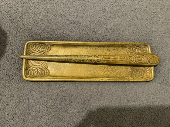 Ontdek een stukje geschiedenis met deze prachtige set van dienblad en briefopener van Tiffany Studios. Deze set, vervaardigd uit fijn brons, belichaamt de elegantie en stijl van de Art Nouveau. De verfijnde versieringen en het kenmerkende ontwerp maken het tot een echt verzamelobject.