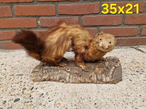 Deze opgezette marterachtige is een unieke toevoeging aan uw interieur, perfect voor liefhebbers van taxidermie en natuurhistorische objecten. Het dier is vakkundig geprepareerd en gepresenteerd op een rustieke houten basis, waardoor het een authentieke uitstraling heeft die elke ruimte kan verrijken.
