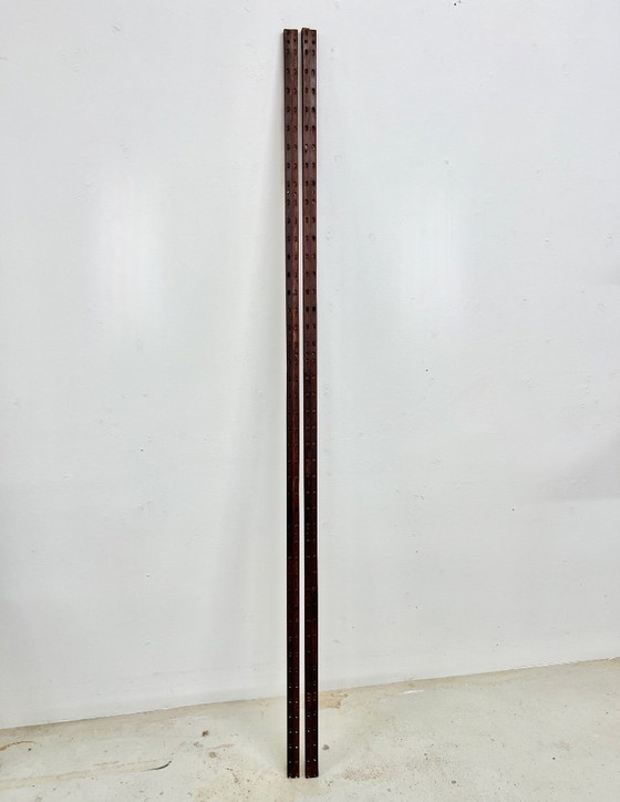Set van 2 kledingrails voor het CADO-systeem van Poul Cadovius. Deze rails zijn 200 cm lang en hebben twee sets gaten. Ze zijn gemaakt van mahoniehout met een palissanderbeits.