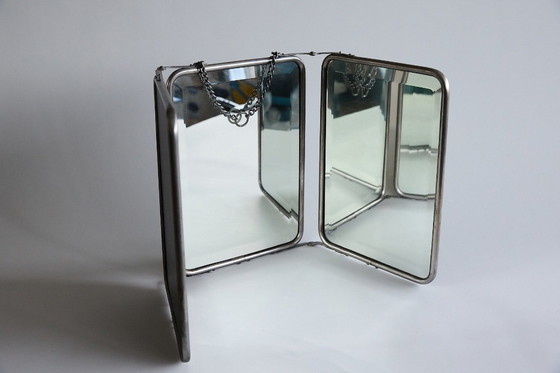 Opvouwbare barber triptiekspiegel, rond jaren 30 met ketting om op te hargne, hele goede staat, enkele vlekjes en krasjes hier en daar, open ongeveer 60 cm op 27 cm