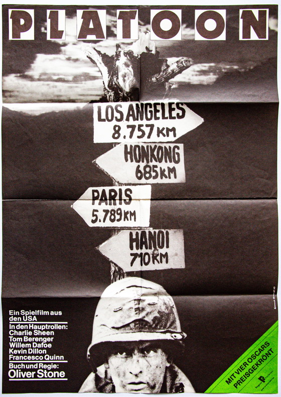 Originele Duitse filmposter van het Oliver Stone drama 'Platoon' uit 1986. De poster is gemaakt in 1989 toen de film werd uitgebracht in Oost-Duitsland. Het is een zeer zeldzame DDR-poster van een Amerikaanse film.