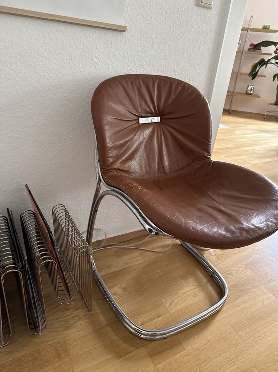 Betreed de wereld van tijdloos design met deze originele Rima Sabrina Rinaldi stoel, een iconisch stuk uit het Bauhaus- en Mid-Century Modern-tijdperk. Het slanke chromen frame en de rijke bruine lederen bekleding stralen verfijning en elegantie uit, waardoor het een perfecte aanvulling is op elk modern interieur.