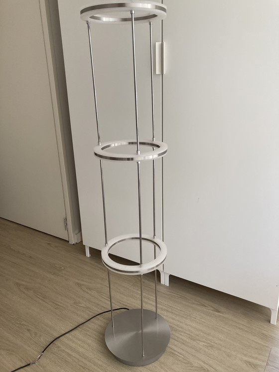 Deze vloerlamp is van roestvrij staal, in een matte uitvoering. Hij bestaat uit drie LED-boven elkaar staande cirkels. De stijl is modern, strak. Hoogte 134 cm, breedte 30 cm. De lamp is dimbaar, maar de (vloer)dimmer ontbreekt.