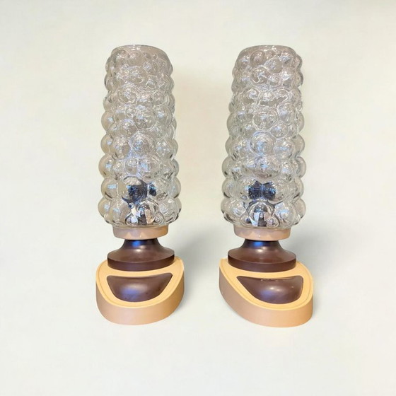 Deze twee bedlampjes uit de jaren 70 weerspiegelen de tijdgeest en space age design in zijn puurste vorm. Nieuwe materialen zoals plastic en geperst glas met een bubbellook zijn vakkundig gecombineerd om de inrichtingsstijl naar een nieuw tijdperk te brengen.