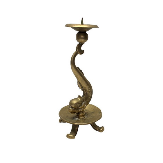 Deze bronzen vis kandelaar uit Frankrijk, eerste helft 20e eeuw, is een bijzonder en decoratief interieurobject. De kandelaar is vervaardigd uit brons en heeft de vorm van een vis, wat het object een speels en karaktervol ontwerp geeft.