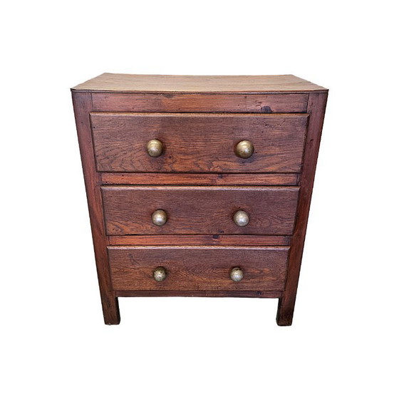 Oude Franse 3 laden commode, afkomstig uit circa 1940. Prachtige en stoere houten 3 laden commode met op elke lade 2 grote metalen bollen. Dit betreft een schuurvondst en opnieuw gebeitst.