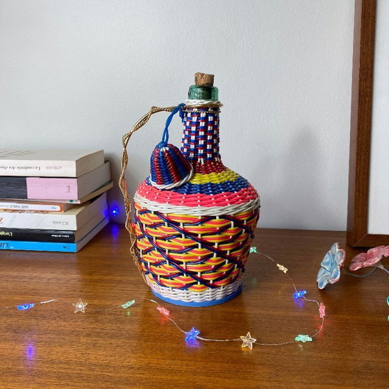 Vintage glazen fles met plastic vlechtwerk