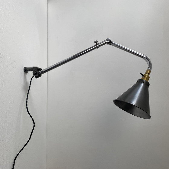 De reflector is geschuurd en aan de buitenkant antraciet gepatineerd, net als de wandvoet. De verschillende armen hebben chromen accenten en kleine roestplekjes.