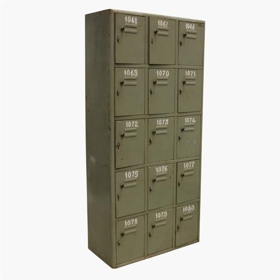 De kluisjes zijn genummerd van 1008-1020 (op 2 foto's is een andere nummering te zien). De kast ziet er flink verweerd/doorleefd uit, met hier en daar roest, ook aan de binnenkant.