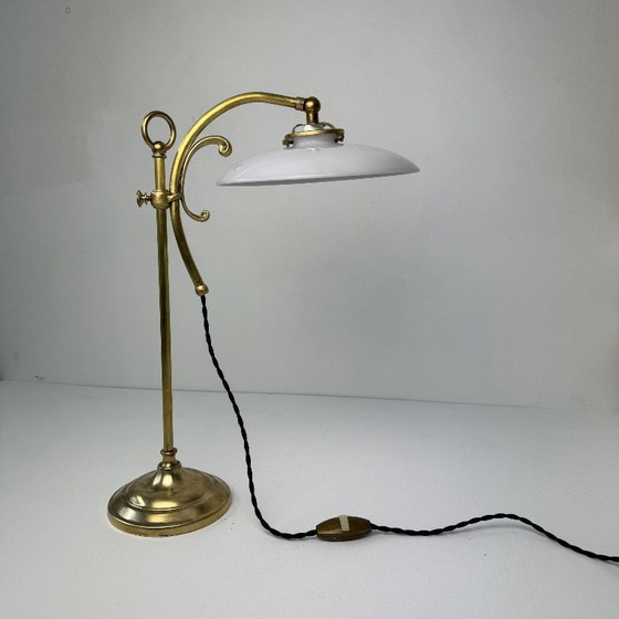 Een bureaulamp uit 1950 met een prachtige opaline kap.