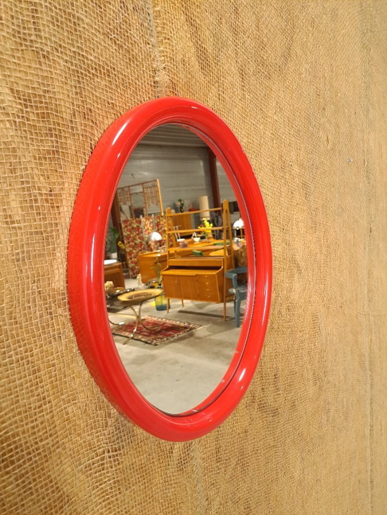 De ovalen wandspiegel is in een goede conditie, met gebruikssporen, passend bij de vintage leeftijd. De spiegel is in het echt iets minder fel rood, iets warmer van kleur. Aan de zijkant zit een de wandkant een klein barstje in het kunststof.