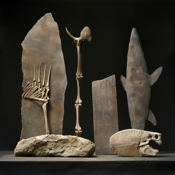 Echo's van verloren soorten duiken op in *Remnants of an Extinct Symphony*, waar botten en fossielen zijn gecomponeerd als een stil orkest van vergeten leven. De delicate balans tussen organische vormen en geologische structuren benadrukt de langzame erosie van geheugen en materie, vereeuwigd door dramatisch clair-obscur.
