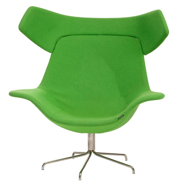 Oyster chair van Michael Sodeau voor Offecct Oyster high chair, ‘anti-social’ versie met aluminium frame en groene bekleding Ontworpen door Michael Sodeau voor 'Offecct', Zweden 100 cm bred, 60 cm diep en 107 cm hoog, zithoogte 38 cm Licht, esthetisch, geïnjecteerd polyurthaanschuim, ambachtelijk vervaardigd (met de hand afgewerkt) Minimale gebruikssporen