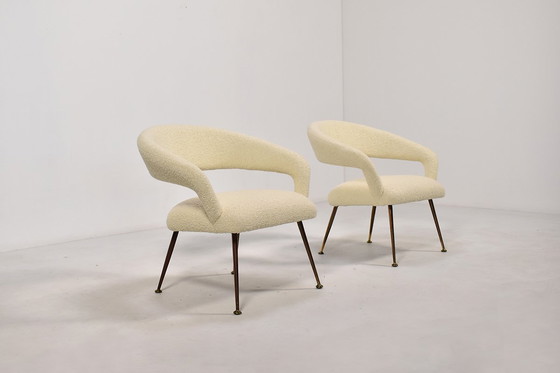 Paar zeldzame loungestoelen met U-rugleuning ontworpen door Gastone Rinaldi, Model DU 55, geproduceerd door RIMA, Italië. De verende rugleuning geeft elasticiteit aan de structuur en maakt optimaal gebruik van een constructie van metalen buizen. RIMA diende later een patentaanvraag in voor het ontwerp. Uitgevoerd met gepatineerde messing poten en nieuwe crème boucle bekleding.