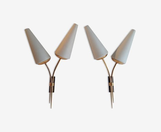 Paar dubbele wandlampen. Organisch ontwerp. Wit gesatineerd opaline en messing. Een bijzonder elegant decoratief stuk. Enige slijtage in overeenstemming met de leeftijd en het gebruik, maar in zeer goede staat zoals te zien op de foto's. Echt vintage. Echt vintage. Hoogte: 50 cm.