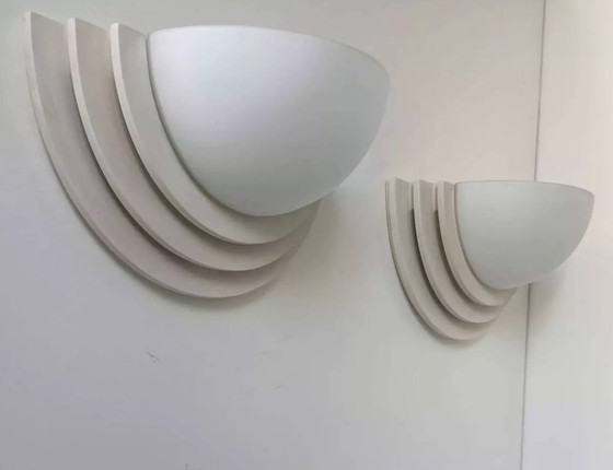 Paar geometrische wandlampen van gips en gezandstraald glas, Frankrijk 1970