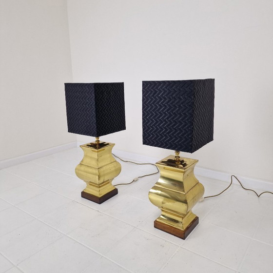 Paar grote Italiaanse Regency stijl tafellampen - Messing en hout met zwarte kappen