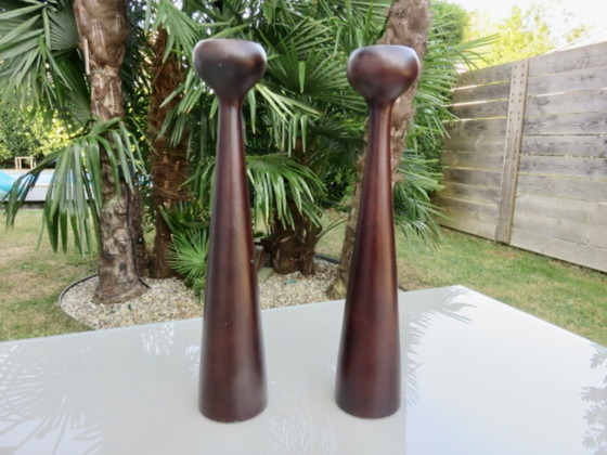 Paar grote Scandinavische houten kandelaars, vintage, jaren 70