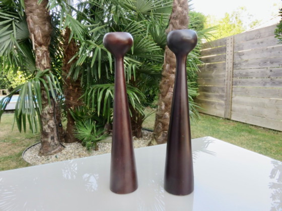 Paar grote Scandinavische kandelaars van teakhout, jaren 70. Hoogte 35cm. Diameter voet 7cm. In zeer goede staat met kleine gebruikssporen. 2 andere identieke kandelaars zijn te koop in mijn shop in een andere advertentie (zie laatste 2 foto's).