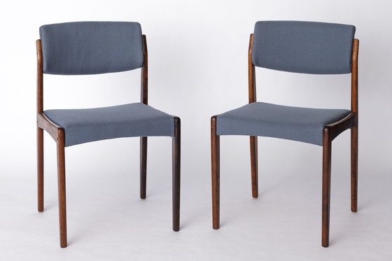 Deze elegante set van twee eetkamerstoelen is ontworpen door H.W. Klein voor de bekende Deense fabrikant Bramin in de jaren 1960. De frames zijn gemaakt van massief Braziliaans palissander en zijn zorgvuldig opgeknapt en geolied, waardoor de natuurlijke diepte en rijkdom van de houtnerf wordt benadrukt.