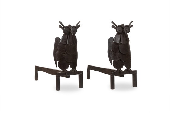 Paar ijzeren vuurijzers, voorstellende een uil. Frans werk gemaakt in de jaren 1950. Afmetingen : H 34 x B 15 x D 35 cm Referentie : LS6267409P