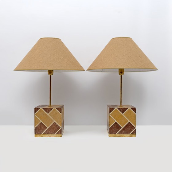 De lampen werden in de jaren 20 in Italië gemaakt met cementtegels met geometrische decoraties die typisch zijn voor Art Nouveau. De frames van de voet zijn van messing, inclusief de lampenkapbevestigingen.