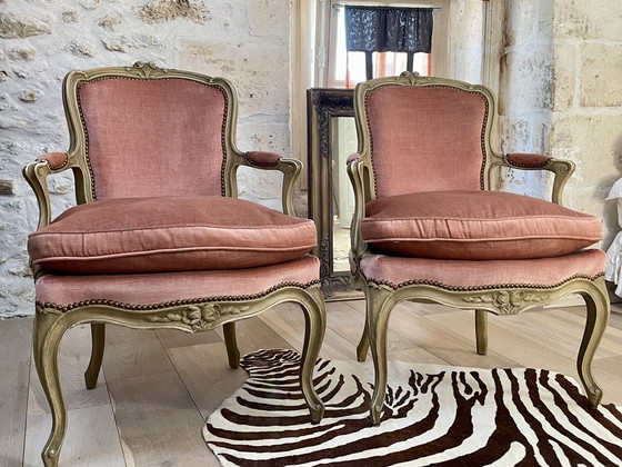 Paar antieke Louis XV stijl cabriolet fauteuils, poederroze fluwelen stof, in zeer goede staat.