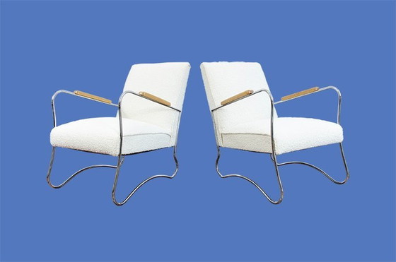 Een paar fauteuils van de Fabryka Mebli Wschód, Zadzie, Polen, jaren 1950. De fauteuils zijn gerestaureerd, inclusief het opnieuw verchromen van de metalen elementen. De lange, elegante armleuningen zijn gemaakt van eikenhout en de zittingen zijn opnieuw bekleed met een witte boucle stof. Het golvende metalen frame van dit model geeft de essentie van de Mid Century moderne stijl perfect weer. Op verzoek kunnen we de kleur van de bekledingsstof in onze winkel veranderen.