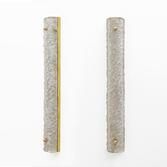 Deze wandlampen zijn gemaakt van gestructureerd Murano-glas met een Scavo-effect, een soort sierglas met een ruw en ondoorzichtig oppervlak aan de binnenkant en een afwerking die antiek glas imiteert, voornamelijk grijs. De ondersteunende structuur is van messing. Perfect voor het creëren van het perfecte warme licht in elke omgeving. Elke wandlamp is uitgerust met drie G9 lamphouders en is bedraad volgens Europese en Amerikaanse normen. Andere paren verkrijgbaar, vraag naar de beschikbaarheid.