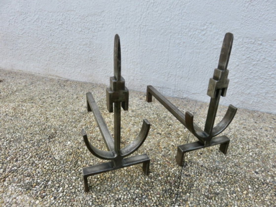 Paar modernistische vuurijzers uit de jaren 1950. Frans werk in de stijl van (of door) Gilbert Poillerat of Raymond Subes. Gesmeed en gehamerd staal. Hoogte 35cm. Breedte 16cm. Diepte 40cm. Gewicht 5,5kg per paar. Prachtig ijzerwerk.