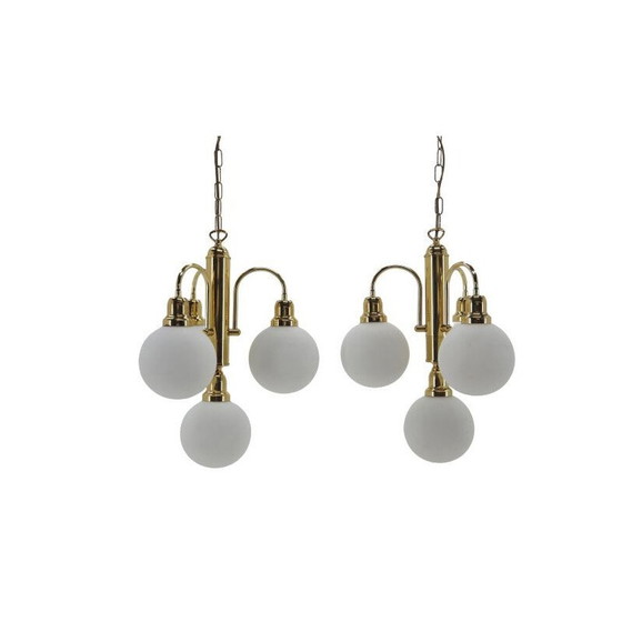 Paar oude kroonluchters van glas en messing met globes, Tsjecho-Slowakije