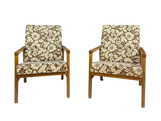 Een charmant paar retro fauteuils uit het Tsjecho-Slowakije van de jaren 1960. Met de originele gebloemde bekleding in zeer goede vintage staat, zijn deze stoelen structureel gezond en vertonen ze slechts minimale gebruikssporen. Het warme houten frame vult de bekleding aan en draagt bij aan het retro-karakter van de set.