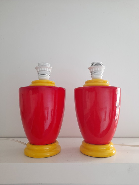 Zeer mooi paar rood-gele keramische lampenvoeten. Rechtstreeks uit de jaren 80, geïnspireerd op Memphis! Zeer goede staat. Het is aan jou om mooie lampenkappen te kiezen om ze te accentueren.