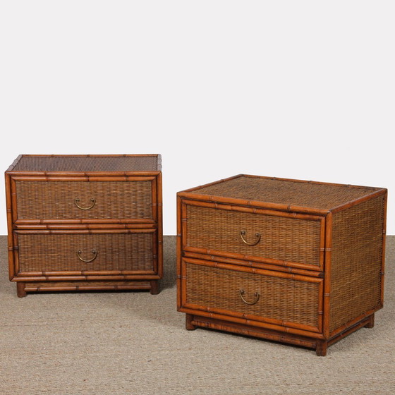 Dit paar nachtkastjes dateert uit de jaren 1960. De structuur is van rotan en bamboe. De handgrepen zijn van messing. Deze nachtkastjes zijn in goede vintage staat.