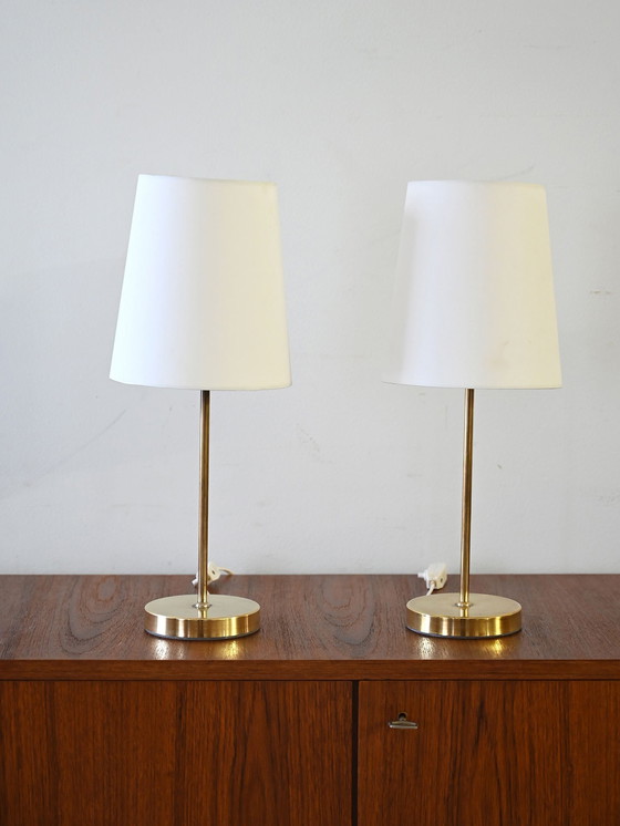Paar Scandinavische bedlampjes uit de jaren 1950/60. De slanke stelen van gepolijst messing zijn gecombineerd met conische kappen van lichte stof, die een strakke en elegante uitstraling hebben. De lijnen zijn minimaal en evenwichtig, trouw aan de Scandinavische esthetiek van die periode.