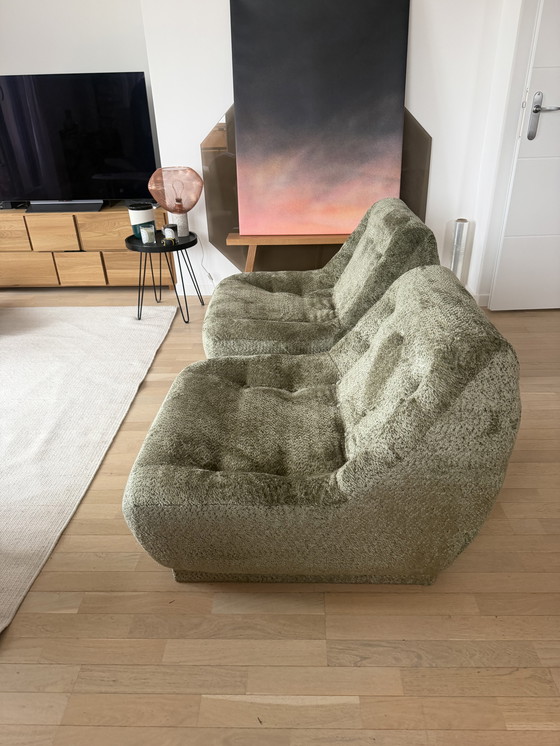 Fauteuils/lounges in Space Age-stijl in uitstekende staat, recent opnieuw bekleed met groen fluweel met een zilverachtige glans.